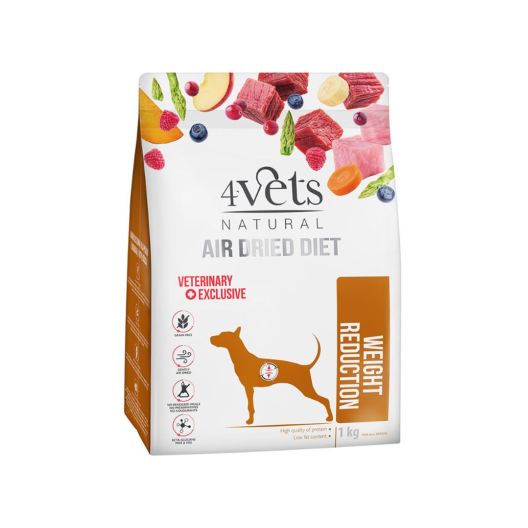 4Vets NATURAL Weight Reduction — полноценный сухой ветеринарный рацион, рекомендованный для собак с избыточным весом или ожирением, а также после стерилизации. Благодаря низкому содержанию жира и добавлению L-карнитина он поддерживает процесс снижения веса у собак. Повышенное содержание клетчатки снижает чувство голода. Преимущества: содержит инулин цикория — это пребиотик, т. е. питательное вещество для физиологической бактериальной флоры кишечника. Правильная кишечная флора препятствует развитию патологических бактерий в пищеварительном тракте животных, а значит, предотвращает заболевания пищеварительного тракта, содержит L-карнитин — обеспечивает целенаправленную и более легкую транспортировку жирных кислот в митохондрии, где они эффективно метаболизируются. Благодаря L-карнитину увеличивается скорость метаболизма и эффективность липолиза жировой ткани, содержит диметилсульфон (метилсульфометан) — наличие этого ингредиента в рационе является важным фактором снижения болевых ощущений, связанных с нагрузкой на опорно-двигательный аппарат у собак с избыточным весом и ожирением, содержит малое количество жира — низкое содержание жира и наличие жирных кислот из животного сырья обеспечивают максимальную задействованность функций печени и поджелудочной железы и увеличивают время их переваривания. Кроме того, полиненасыщенные жирные кислоты из семейства омега-3 и омега-6, присутствующие в лососевом жире и масле черного тмина, в соответствующих пропорциях определяют биохимический контроль воспалительных процессов, содержит пищевые волокна — высокое содержание пищевых волокон (из овощей и фруктов и целлюлозы) обеспечивает надлежащее усвоение воды пищей, благодаря чему используемая диета увеличивает чувство сытости и наполнения пищеварительного тракта, что в последствии влияет на более быструю стимуляцию центров насыщения и снижает чувство голода, содержит семена подорожника — они сочетают в себе свойства высокорастворимой клетчатки с низким уровнем ферментируемости в тонком кишечнике, оказывая положительное влияние на улучшение перистальтики кишечника. Кроме того, они обладают способностью связывать воду и образовывать гель, тем самым нормализуя прохождение пищевого содержимого. Продукт может иметь белый налет, что является результатом естественной кристаллизации мясных ингредиентов. Это не влияет на качество корма. Вы можете найти влажный корм из этой же серии здесь Упаковка: 1 кг