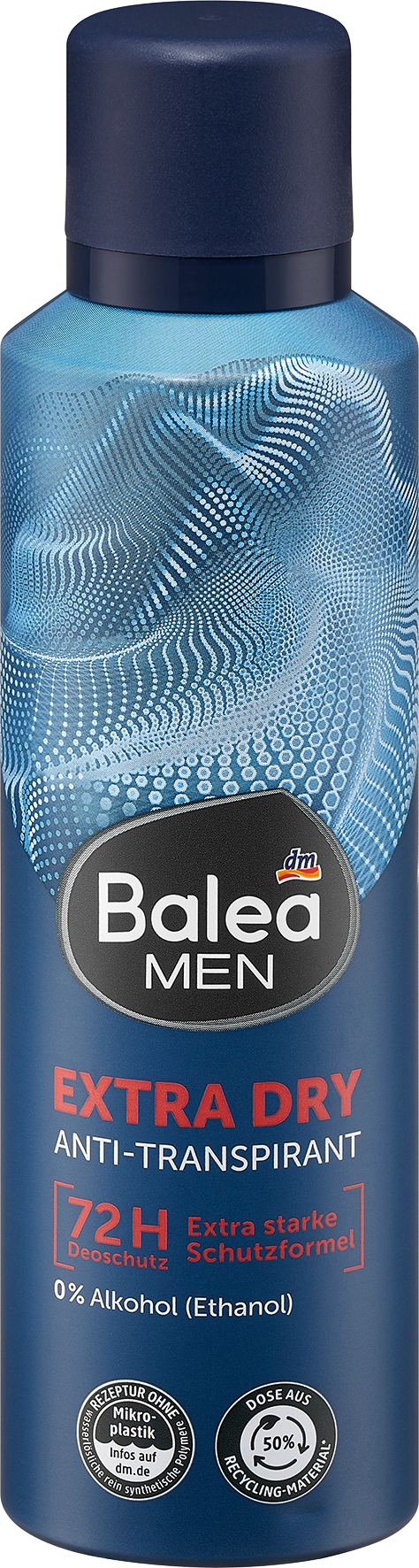 Антиперспирант-дезодорант-спрей. Ограничивает потоотделение и нейтрализует неприятные запахи. Защита до 72 часов. Мягкий для кожи, веганский продукт. Не содержит спирта (этанола). Ищете надежного помощника в борьбе с запахом пота даже в самые загруженные дни? Антиперспирант-дезодорант-спрей Balea MEN Extra Dry обеспечит вам защиту и свежесть до 72 часов! Благодаря комплексу Extra-Dry, его веганская формула эффективно удерживает пот и нейтрализует неприятные запахи, помогая дольше сохранять подмышки сухими, а кожу увлажненной. Более того, антиперспирант-дезодорант-спрей Balea MEN Extra Dry не содержит микропластика, синтетических водорастворимых полимеров и спирта (этанола). Выберите Balea MEN и встречайте день с уверенностью, наслаждаясь длительным ощущением свежести! Код товара dm: 1692722 GTIN: 4066447600056