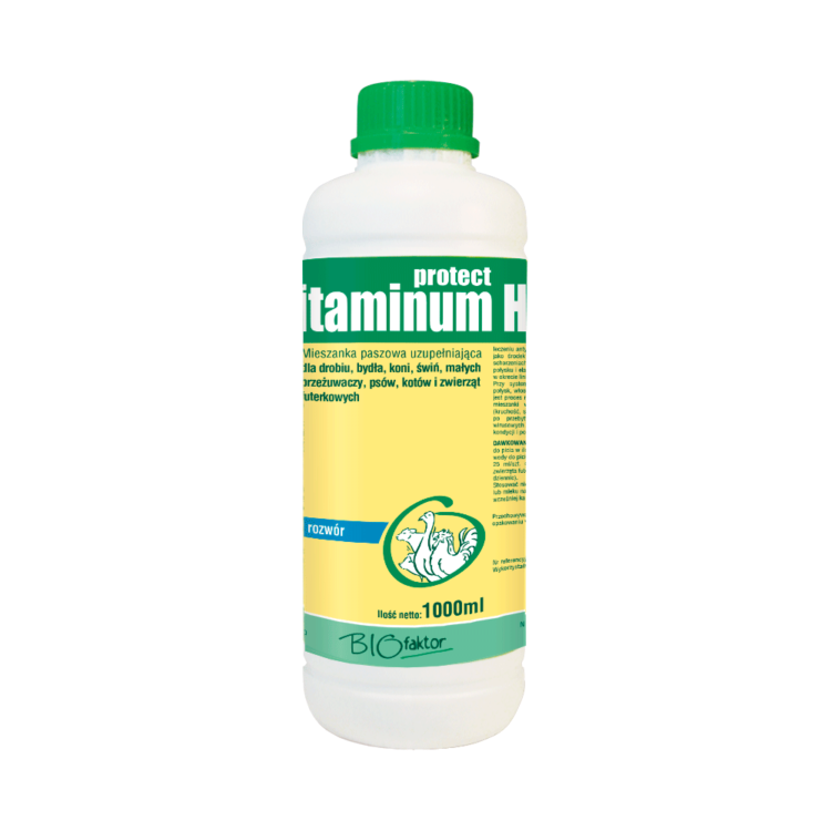 Vitaminum H Protect – кормовая добавка для птицы, крупного рогатого скота, лошадей, свиней, мелкого рогатого скота, собак, кошек и пушных зверей. Витамин H (биотин) участвует во многих обменных процессах в организме (в синтезе некоторых аминокислот, жирных кислот, белково-углеводном обмене). Дефицит витамина H снижает иммунитет и здоровье кожи, нарушает ее функционирование и ухудшает качество и развитие кожных продуктов (перьев, волос, когтей, копыт, ногтей). Аминокислоты, входящие в состав препарата, влияют на обмен белков в организме. Смесь применяется профилактически для дополнения рациона биотином и отдельными аминокислотами. Рекомендуется в период роста и развития, в период формирования и формирования шерстного покрова, а также у животных, склонных к кожным заболеваниям. У птицы Vitamin H protect можно применять при ослабленном состоянии, недоразвитии организма, при слабом оперении, при воспалениях кожи преимущественно в области клюва, на ногах и когтях, а также при выпадении и повышенной ломкости перьев. У птиц витамин Н рекомендуется назначать при диагностированном жировом гепатозе и почечном синдроме, после бактериальных, вирусных, паразитарных заболеваний и после проведенного лечения антибиотиками и сульфаниламидами. У млекопитающих витамин Н, как поддерживающее средство, применяют при диагностированных кожных заболеваниях (экзема, выпадение и выпадение шерсти, потеря блеска и эластичности шерсти, ломкость и хрупкость шерсти), в период линьки и после дерматологических заболеваний. При систематическом применении биотина шерсть приобретает блеск, волосы становятся гуще и эластичнее, ускоряется процесс регенерации кожных тканей. Целесообразно назначать смесь при нарушениях развития копыт и когтей (ломкость, щели, бороздки), при нарушениях фертильности и после метаболических, бактериальных, вирусных и паразитарных заболеваний, а также при ослабленном состоянии и склонности к аллергии. Количество нетто: 1000 мл.