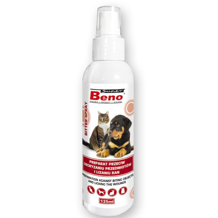 SUPER BENO BITTER SPRAY от кусающих предметов и зализывания ран. Препарат, благодаря использованию чрезвычайно горького, но безопасного для животных вещества, эффективно защищает от укусов мебель, обувь, ковры, растения. Средство также можно использовать, когда у питомца есть раны и мы хотим предотвратить их зализывание. Препарат действует на собак, кошек, грызунов, кроликов. Средство нетоксичен для людей и животных, не оставляет пятен, не имеет запаха. Упаковка: 125 мл