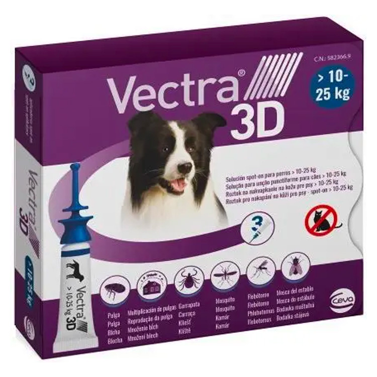 Ветеринарные препараты против паразитов в виде капель от блох, клещей, комаров, мошек и оводов для мелких собак. Свойства: убивает блох и предотвращает повторное заражение в течение 1 месяца; подавляет вылупление яиц и превращение незрелых блох во взрослых особей в течение 2 месяцев; убивает и отпугивает клещей в течение 1 месяца; убивает клещей в течение первых 48 часов после применения (до недели), рекомендуется использовать устройство для удаления клещей; отпугивает (предотвращает укусы) летающих насекомых, таких как комары, мошки и мухи-жигалки в течение 1 месяца после применения; можно применять щенкам с 7-недельного возраста и весом более 1,5 кг. Противопоказания: не применять кошкам; не позволять кошке облизывать собаку после закапывания капель; не применять при повышенной чувствительности к действующим или вспомогательным веществам. Упаковка: 3 пипетки емкостью 3,6 мл, каждая из которых подходит для собаки весом от 10 до 25 кг.