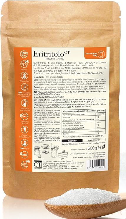 Размеры продукта 5 x 5 x 18 см; 600 граммов Единица 600,0 граммов Рекомендации по подаче 1,4 г эритрита = 1 г сахара Бренд CTn764Laboratories Форма выпуска Гранулированный Производитель TrentoPet Вес продукта 600 г Страна происхождения Италия