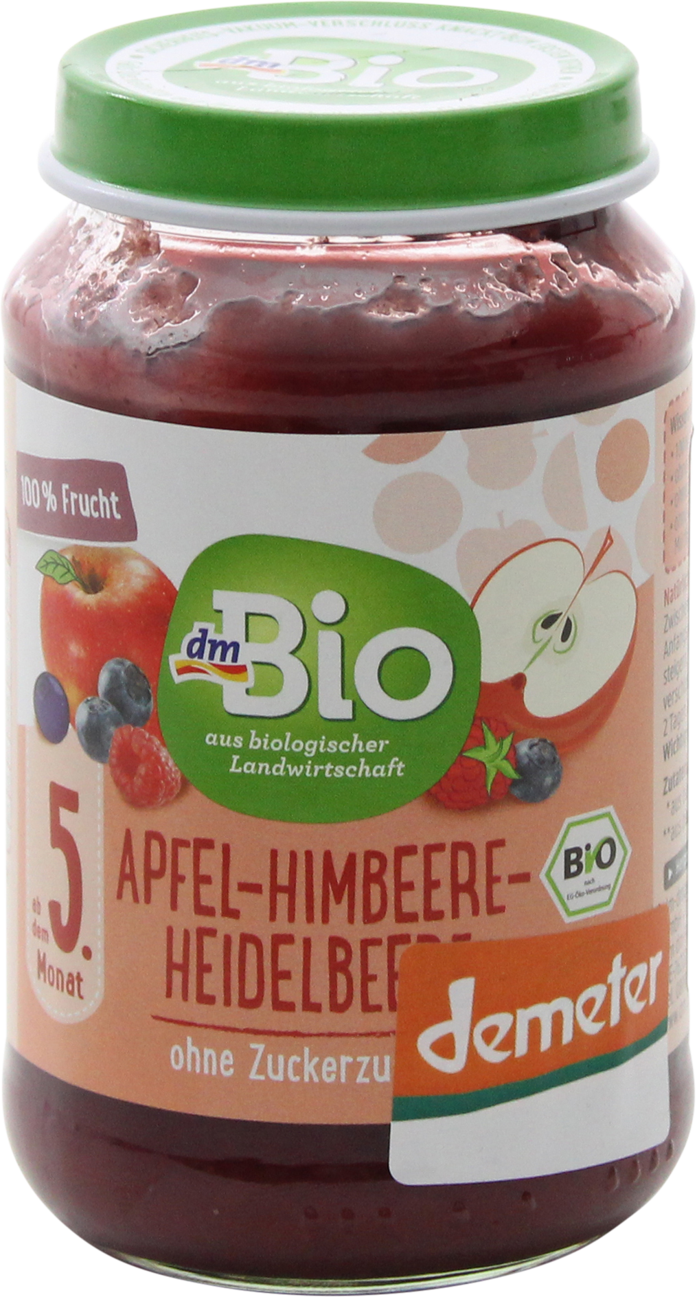 Подходит для детей от 5 месяцев. Вкус: яблоко, малина и черника. Подходит для детей от 5 месяцев. С мелко измельченными фруктами. Без добавления ароматизаторов. Вкусное фруктовое пюре dmBio идеально подходит для детей от 5 месяцев. Яблоко, малина и черника создают просто восхитительную смесь, богатую витаминами. Изготовлено из высококачественных ингредиентов с ферм, сертифицированных по стандарту Demeter, без добавления ароматизаторов, загустителей, молока или концентрированных фруктовых соков. Мелко измельченное пюре можно употреблять отдельно или использовать для приготовления других детских блюд. Витаминная бомба, идеально подходящая в качестве десерта или даже перекуса между приемами пищи. Код товара dm: 1488298 GTIN: 4058172438035