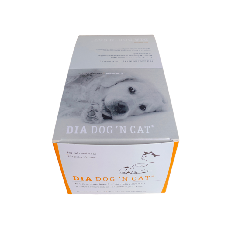 Dia dog’n cat — комплексный диетический продукт, специально разработанный для приема во время и сразу после острой диареи. Используемые натуральные ингредиенты были выбраны в соответствии с современными знаниями о регуляции расстройств пищеварения. Пропектины и бентонит: защита слизистой оболочки пищеварительного тракта путем создания геля на ее поверхности связывание бактерий, вирусов, токсинов и других вредных веществ стимуляция роста желаемых штаммов бактерий (пробиотический эффект пектинов) стимуляция перистальтики кишечника защита от ацидоза в просвете кишечника Олигосахариды: стимуляция роста желаемых кишечных бактерий (Lactobacillus, Bifidobacterium). Электролиты: уравновешивание дефицитов, возникающих в результате потери воды Буферные вещества и натуральные органические кислоты: профилактика метаболического ацидоза Легкоусвояемые питательные вещества: обеспечение легкоусвояемой энергией, благодаря действию, стимулирующему перистальтику кишечника и образование слизи, облегчает удаление комков шерсти (трихобезоаров) из пищеварительного тракта кошек. Вы можете найти пробиотик для кошек Dia dog`n в форме пасты здесь Упаковка: 60 таблеток