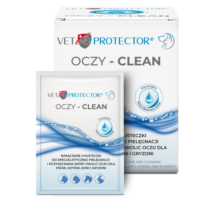 VET PROTECTOR® EYES – CLEAN – пропитанные салфетки для специального ухода и очищения кожи вокруг глаз. Удаляют загрязнения и выделения с век и краев век. Питают кожу век и поддерживают процессы регенерации, а также обеспечивают уменьшение обесцвечивания и слезных пятен.
