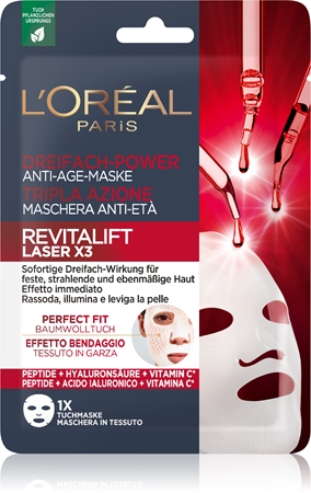 Описание L’Oréal Paris Revitalift Laser Антивозрастная тканевая маска L’Oréal Paris Revitalift Laser X3 обогащена тремя важными активными ингредиентами: витамином С, гиалуроновой кислотой и пептидами, которые играют важную роль в процессе клеточного старения. Кожа мгновенно становится более упругой, глубоко увлажненной и сияющей, просто омолаживается. Особенности: борется с признаками старения с немедленным результатом, интенсивно увлажняет, укрепляет кожу, придает коже сияющий вид, изготовлен из трехслойной ткани, идеально прилегает к коже. : гиалуроновая кислота – обладает увлажняющими свойствами, витамин С – оказывает осветляющее и осветляющее действие, пептиды. Способ применения: