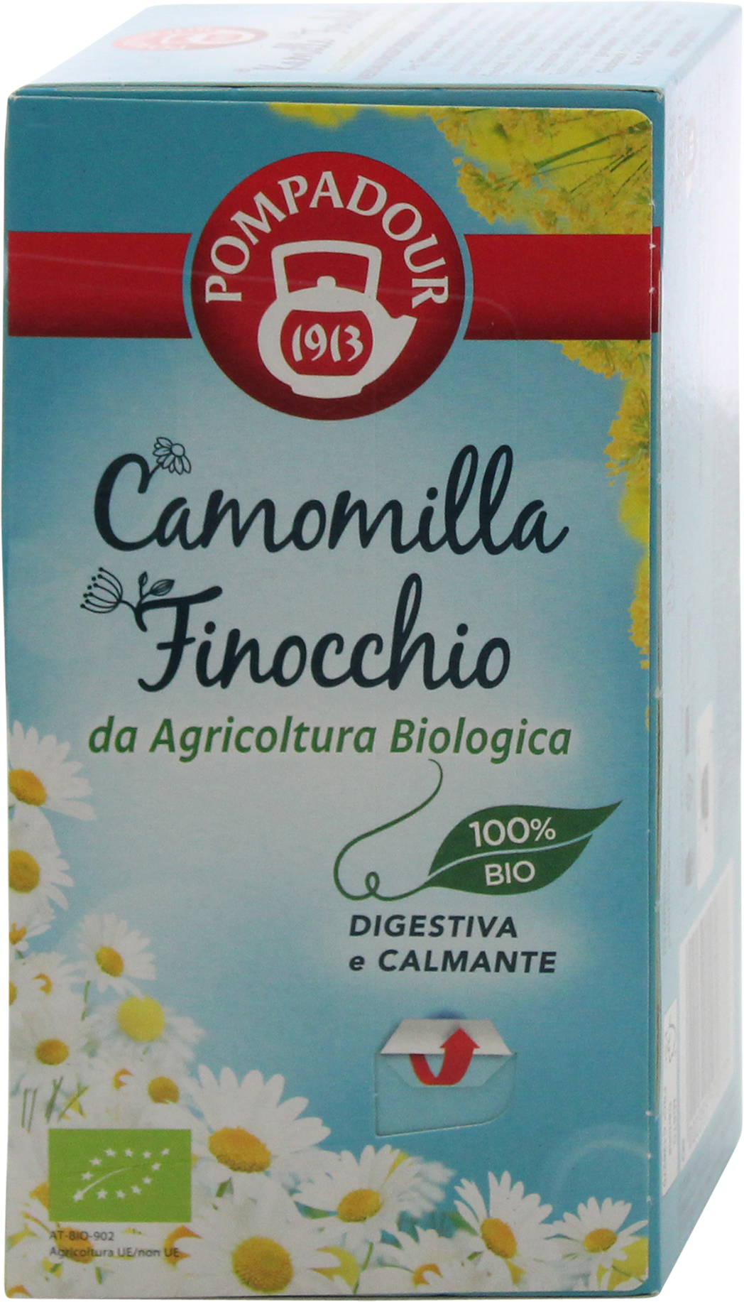 Органический травяной чай. С ромашкой, обладающей расслабляющими и успокаивающими свойствами. С фенхелем, способствующим хорошему пищеварению. Выращено органическим способом. Идеально подходит после еды. Если вы чувствуете необходимость успокоить желудок для улучшения пищеварения, настой ромашки и фенхеля Pompadour — именно то, что вам нужно: это настоящее универсальное средство для тех, кто испытывает проблемы с пищеварением и желудком. Ромашка обладает расслабляющим и спазмолитическим действием, а фенхель препятствует образованию газов, вызывающих изжогу, и способствует пищеварению. Настой ромашки и фенхеля: сладкая и ароматная смесь, сочетающая в себе ценные свойства этих двух ингредиентов. Отлично подходит для употребления после еды, а также для любого времени дня для приятного, расслабляющего перерыва. Код товара dm: 2159295 GTIN: 8002355570773