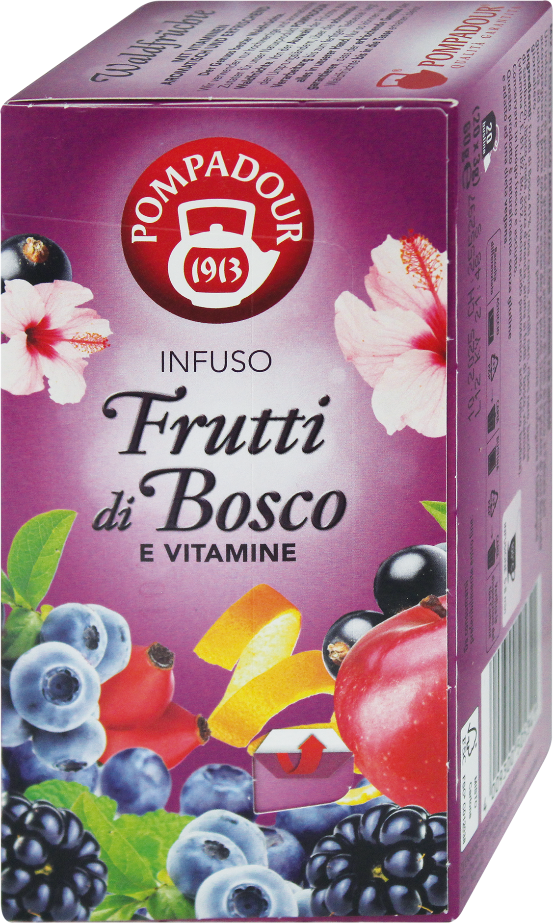 Чайный травяной с ягодами и витаминами, 60 г (20 пакетиков) 41% ягод Витамины C, E и группы B Без глютена Веганский Ищете травяной чай, полезный для тела и ума? Попробуйте травяной чай с ягодами и витаминами от Pompadour! Этот травяной чай, приготовленный из 100% натуральных ингредиентов, включая шиповник, чернику, черную смородину, бузину, гибискус, яблоко, апельсиновую цедру и витамины B, C и E, идеально подходит для ухода за телом и расслабления ума. Витамины C и E являются мощными природными антиоксидантами, а витамины группы B способствуют нормальной работе нервной, умственной и психологической системы. Интенсивный, фруктовый и слегка терпкий аромат подарит вам приятное чувство расслабления, будь то на работе или дома в компании друзей. К тому же, он веганский и безглютеновый, попробуйте! Код товара: 2170103 GTIN: 4009300505341