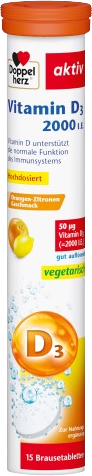 Витамин D3 в форме таблеток, 97 г (15 шт.) Высокорастворимые шипучие таблетки. Высокая доза витамина D3 для укрепления иммунной системы. Вкус апельсина и лимона. Витамин D является важным питательным веществом для нашей защиты, способствуя укреплению иммунной системы и поддержанию крепких костей. Его выработка в организме зависит от различных физических и экологических факторов (время года, погодные условия, одежда, тип кожи, масса тела, а также время пребывания на солнце и его продолжительность). Рекомендуемая суточная доза для взрослых составляет 800 МЕ или 20 мкг витамина D при отсутствии собственной выработки в организме. Одна шипучая таблетка Doppelherz Vitamin D3 2000 МЕ содержит 50 мкг витамина D3 и имеет фруктовый вкус апельсина и лимона. Код товара dm: 2170446 GTIN: 4009932001440