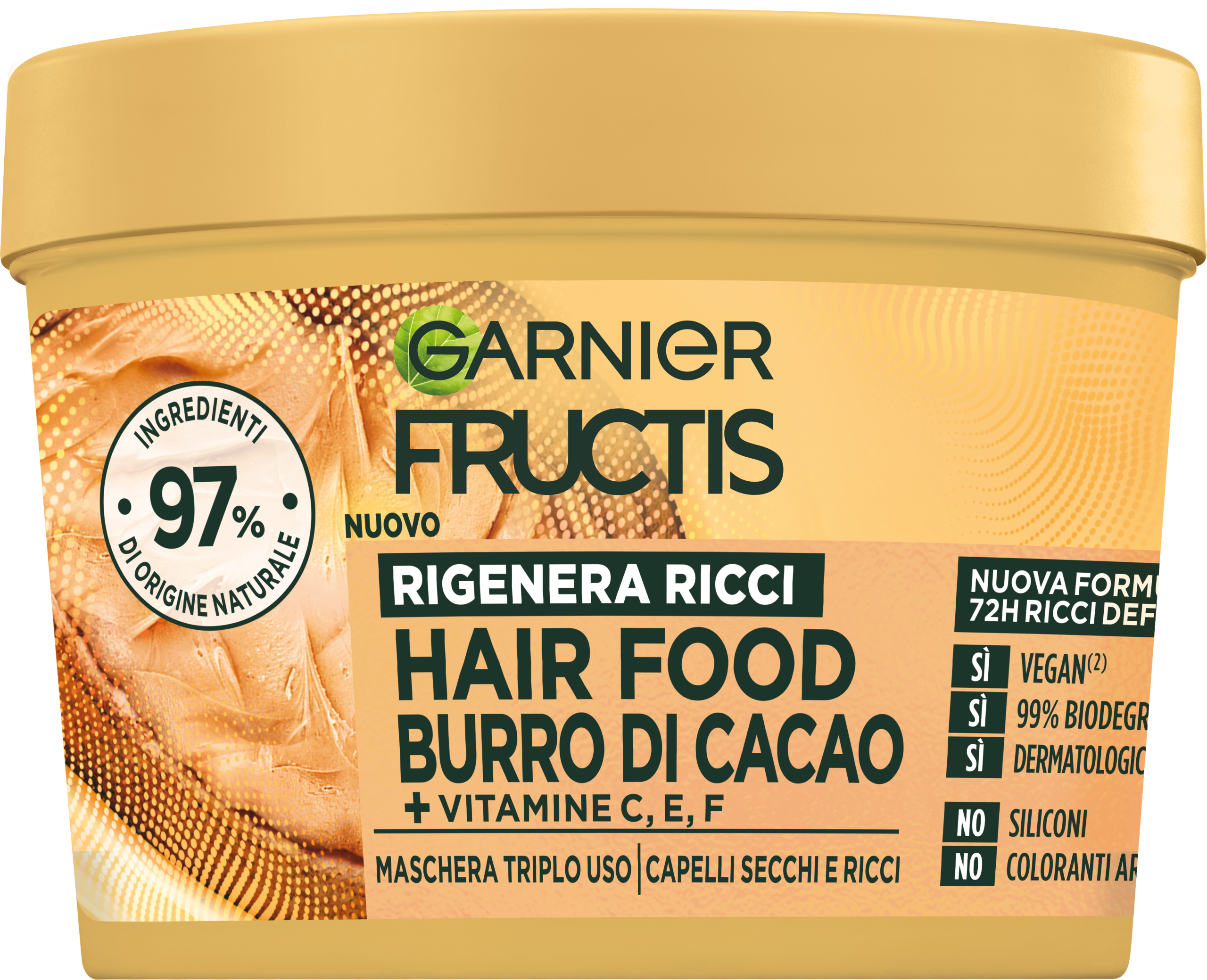 Восстанавливающая маска для волос Hair Food. Для сухих и вьющихся волос. 97% натуральных ингредиентов, без силиконов. Масло какао. Восстанавливает локоны. Маска Fructis Hair Food 3-в-1 с маслом какао идеально подходит для укрощения сухих и вьющихся волос, мгновенно восстанавливая их и предотвращая спутывание. Для интенсивного питания, восстановления и упругости локонов! Ультралегкая формула с 97% натуральных ингредиентов, без силиконов, питает и смягчает волосы, окутывая их сладким ароматом. Код товара dm: 2163668 GTIN: 3600542439367